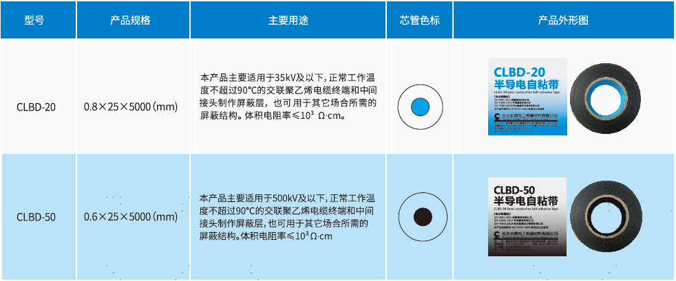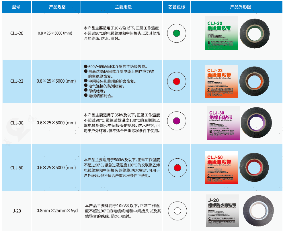 (1)絕緣自粘帶:具有電氣絕緣性能的自粘性丁基橡膠或乙丙橡膠帶狀材料,用于橡塑電纜終端和中間連接的絕緣保護及通訊電纜接頭的絕緣密封。 (2)半導電自粘帶:體積電阻率小于1000Ω·cm的自粘性丁基橡膠或乙丙橡膠帶狀材料,用于固體絕緣電纜接頭和終端的電場屏蔽。